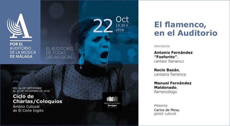 Desde el 24 de septiembre hasta el 26 de diciembre de 2018, el gestor musical Carlos Mesa organiza un ciclo de charlas y coloquios donde se debate la necesidad de impulsar el Auditorio de la Música de Málaga. Las citas tendrán lugar en la Sala de Ámbito Cultural del Corte Inglés y en esta ocasión, el próximo lunes 22 de octubre 'el flamenco llega al auditorio', porque 'el auditorio es de todas las músicas'.