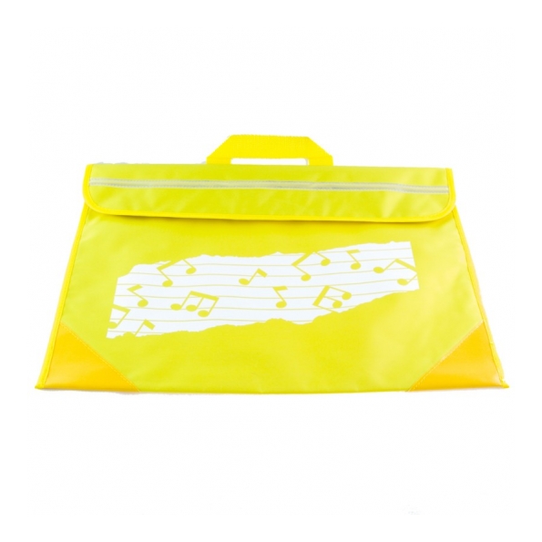 Cartera de poliéster con dibujo de partitura. Resistente al agua con revestimiento de PVC. Cierre con velcro. Compartimento para poner una tarjeta con el nombre del titular en la parte posterior. CARACTERÍSTICAS · Material: poliéster con revestimiento de PVC · Color: amarillo · Motivo: partitura · Medidas: 38 x 28 cm