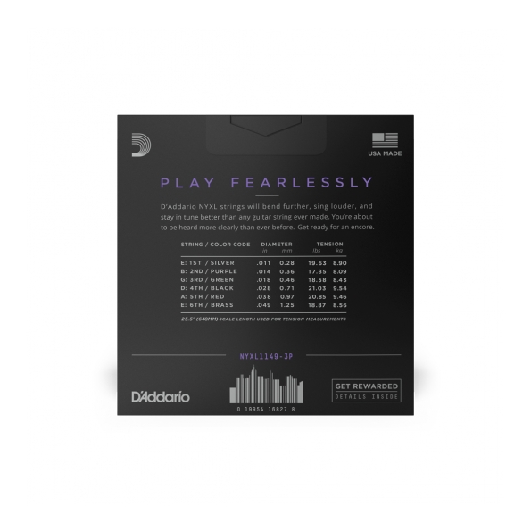 El NYXL1149-3P ofrece una flexibilidad moderada y un tono lleno y grueso: Acero .011, .014, .018, Entorchado de níquel .028, .038, .049