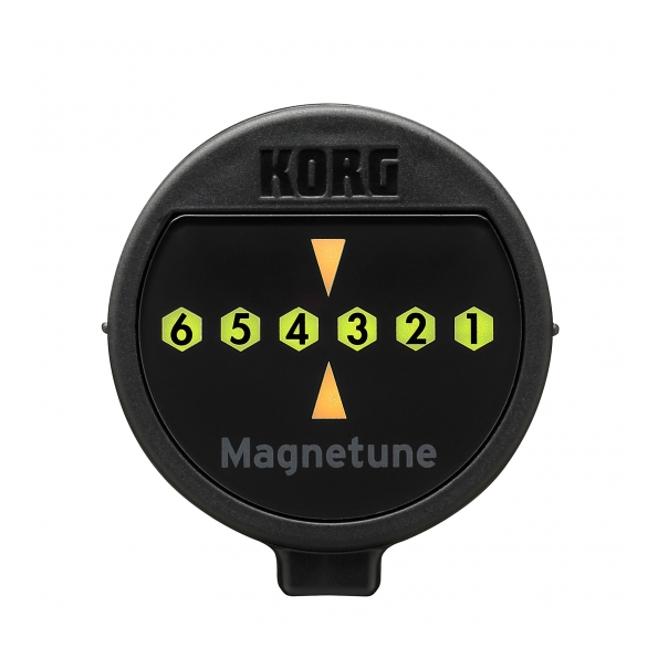 Afinador Korg Magnetune. El Magnetune se sujeta magnéticamente directamente al clavijero y afina tuguitarra. Déjalo en tu guitarra para afinar fácilmente mientras tocas, sujétalo a tu atril, o simplemente llévalo en el bolsillo. Escala: 12-notas temperamento igual. Rango de afinación (onda sinusoidal): E2 (82.41 Hz) ? E7 (2637.02 Hz). Precisión de Detección: +/- 1 centésima. Tono de Referencia: 440 Hz. Dimensiones: 33 x 35 x 13 mm. Peso: 11 g.