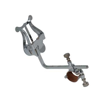 Atril de marcha para corneta con argolla. Argolla abierta con bisagra de Ø18 mm que se ajusta al diámetro específico de cada instrumento gracias a su palomilla. La orientación de la argolla está adaptada para colocarlo en el codo de la tubería. La superficie de contacto del soporte con la corneta se encuentra recubierta con un material suave para proteger el instrumento. El pie del atril tiene diferentes puntos de apoyo para el soporte permitiendo la posibilidad de modificar la distancia visual según necesidades. Muelle de acero. Tamaño NORMAL, las medidas de la lira son 55 x 45 mm. El pie y la argolla del atril son de latón confiriéndole una mayor fortaleza. Acabado cromado. Peso aproximado 58g. Fabricado en España.