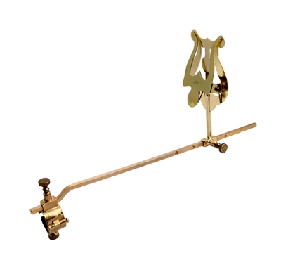 Atril de marcha para trombón con soporte. El soporte de Ø21,3 mm, es abierto con bisagra y se ajusta al diámetro específico del tudel de cada instrumento gracias a su palomilla. La superficie de contacto del soporte con el trombón se encuentra recubierta con un material suave para proteger el instrumento. Atril compuesto por tres piezas (lira, pie y soporte) que permiten regular la posición de la lira alejándola o acercándola de la vista. Muelle de acero. Tamaño SUPER, las medidas de la lira son 70 x 55 mm. Atril reforzado con pie de latón para conferirle mayor fortaleza. Este atril no necesita que el trombón disponga de portatril. Acabado dorado. Peso aproximado 98g. Fabricado en España.