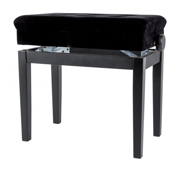 Banqueta de piano con compartimento para partituras. Madera sólida. Patas fijadas al soporte mediante tornillos M10. Carga de rotura de más de 2 toneladasSuperficie del asiento de terciopelo negro. Superficie 57 x 35 cmMedidas del compartimento 29 x 50,5 cm, altura 4 cmAjuste de altura suave mediante mecanismo de precisión. Altura: 52 - 61 cm. Disponible en 5 colores diferentes