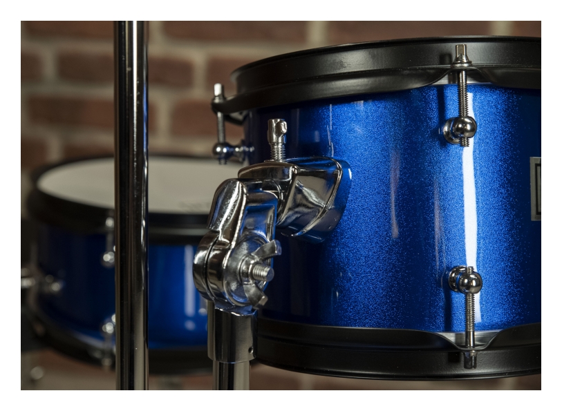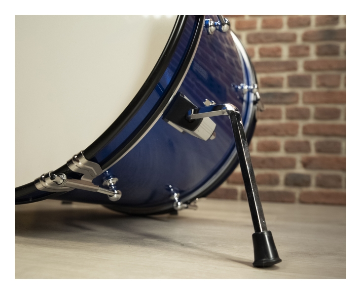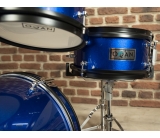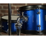 Batería Infantil de tamaño reducido. Madera de álamo. Bombo de 16 x11 , tom aéreo de 8 x6 y cajade 10 x5 , plato de 10 con soporte. Incluye soporte de caja, pedal de bombo, sillín y un par de baquetas. Acabado Azul