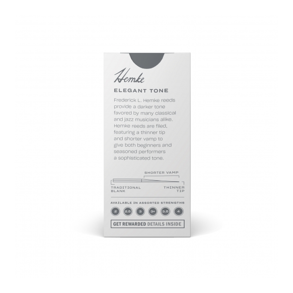 Las cañas Frederick L. Hemke ofrecen un sonido más oscuro que prefieren muchos músicos clásicos y de jazz. Las cañas Hemke están limadas y tienen una punta más delgada y un bisel más corto para aportar tanto a intérpretes principiantes como expertos un sonido sofisticado.