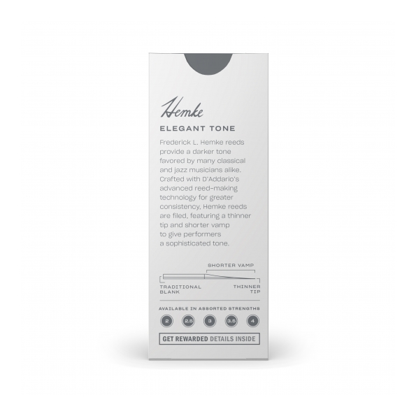Las cañas Frederick L. Hemke ofrecen un sonido más oscuro que prefieren muchos músicos clásicos y de jazz. Las cañas Hemke están limadas y tienen una punta más delgada y un bisel más corto para aportar tanto a intérpretes principiantes como expertos un sonido sofisticado.