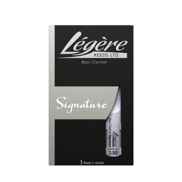 Caña sintética para Clarinete Bajo marca Légère modelo Signature con dureza de 2½. Las cañas Légère son cañas más duraderas que las tradicionales debido a que están construidas a partir de un material sintético (polímero no toxico) resistente a la humedad y a la temperatura ambiental. Además las cañas Légère se pueden desinfectar fácilmente con agua caliente y algún detergente suave.