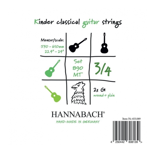 Cuerda para guitarra clásica HANNABACH Serie 890 Guitarra para niños, tamaño 3/4 Diapasón 57-61 cm G3w