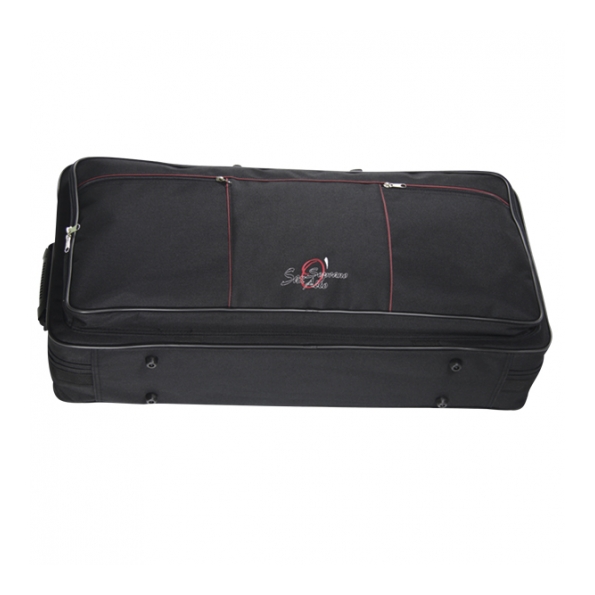 Estuches de poliéster plastificado acolchado, interior terciopelo. Fabricado en poliuretano inyectado. Sistema de mochilas desmontables, bolsillo y dos asas forradas. Asa tipo gusanillo.Cabe el saxo con el tudel. Medidas:76x36x17cm. Peso: 4,2Kg.