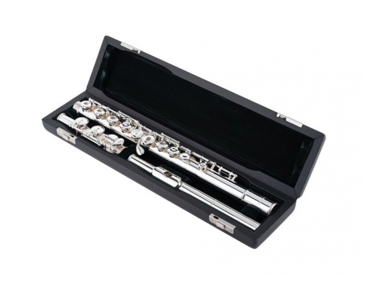 FLAUTA TRAVESERA DESALINEADACabeza y embocadura de plata maciza 925?, cuerpo, mecanismo y pata plateadosCabeza Brezza*Platos abiertos / Mecanismo de miPata de Doincluye estuche y accesorios