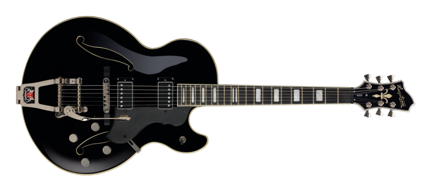 'Tremar HJ-500 - Black Gloss - Contoured Maple Ply Hollow Body, Maple Set neck, Resinator Floating Bridge w/ Roller T-O-M, Hagstrom Tremar, 2 x HJ-50 Alnico 5, 2 x Vol RC-Circuit, 2 x Tone, 3-Way Pick-up Toggle Switch, Scale Length 24.75'', H-Expander Truss Rod, 18:1 Hagstrom Tuners, Resinator Fretboard'