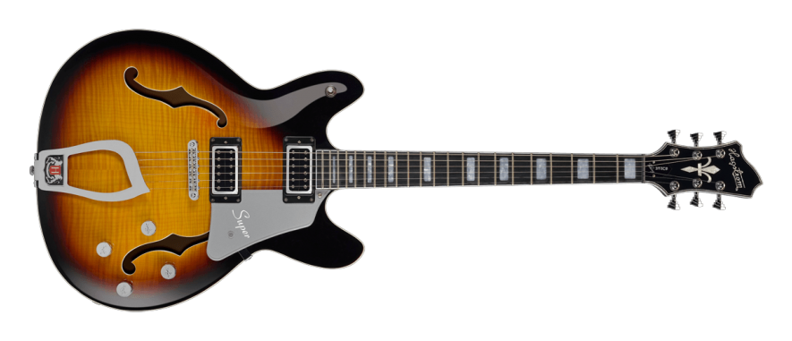 'Super Viking - Tobacco Sunburst, Contoured Ply Flame Maple Semi-Hollow bodyy, Maple Set-Neck, Long throw T-O-M Bridge, Hagstrom Trapeeze, 2 x HJ50 Alnico 5, 2 x Vol RC-Circuit, 2 x Tone (Push/Pulls - Coil Split), 3-Way Pick-up Toggle Switch, 25.50'' Scale Length, H-Expander Truss Rod, 18:1 Hagstrom Tuners, Resinator Fretboard'