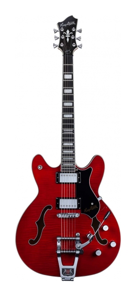 'Tremar Viking DLX - Flamed Wild Cherry Transparent, Contoured Ply-Maple Semi-Hollow body, Maple Set-Neck, Roller T-O-M Bridge, Hagstrom Tremar, 2 x HJ50 Alnico 5, 2 x Vol RC-Circuit, 2 x Tone, 3-Way Pick-up Toggle Switch, 24.75'' Scale Length, H-Expander Truss Rod, 18:1 Hagstrom Tuners, Resinator Fretboard'