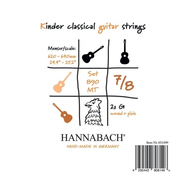 Juego Cuerdas para guitarra clásica HANNABACH Serie 890 Guitarra para niños 7/8 Diapasón 62-64 cm