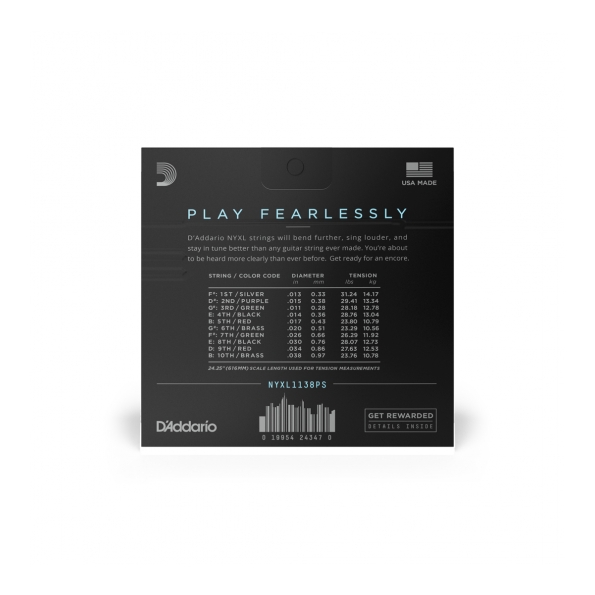 Las cuerdas para guitarra D’Addario NYXL se estirarán más, tendrán más volumen y mantendrán la afinación mejor que cualquier otra cuerda que usted haya tocado antes. Ideado, perfeccionado y fabricado por D’Addario en Nueva York, este núcleo de acero al carbono y aleación de acero liso de nuevo desarrollo y resistente a las roturas ofrecen todo un nuevo nivel de libertad, confianza y potencia. Las NYXL ofrecen más resistencia y hasta un 131 % más de estabilidad de afinación al utilizar un proceso de estirado de cable totalmente reinventado combinado con un revolucionario proceso de «torsión de fusión» para las cuerdas de acero liso. Los enrollados de cuerda chapada en níquel reformulados tienen mayores propiedades magnéticas que les confieren una mayor potencia de salida y mejor respuesta a las frecuencias medias para mayor presencia y ataque.