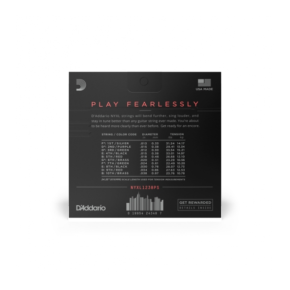 Las cuerdas para guitarra D’Addario NYXL se estirarán más, tendrán más volumen y mantendrán la afinación mejor que cualquier otra cuerda que usted haya tocado antes. Ideado, perfeccionado y fabricado por D’Addario en Nueva York, este núcleo de acero al carbono y aleación de acero liso de nuevo desarrollo y resistente a las roturas ofrecen todo un nuevo nivel de libertad, confianza y potencia. Las NYXL ofrecen más resistencia y hasta un 131 % más de estabilidad de afinación al utilizar un proceso de estirado de cable totalmente reinventado combinado con un revolucionario proceso de «torsión de fusión» para las cuerdas de acero liso. Los enrollados de cuerda chapada en níquel reformulados tienen mayores propiedades magnéticas que les confieren una mayor potencia de salida y mejor respuesta a las frecuencias medias para mayor presencia y ataque.