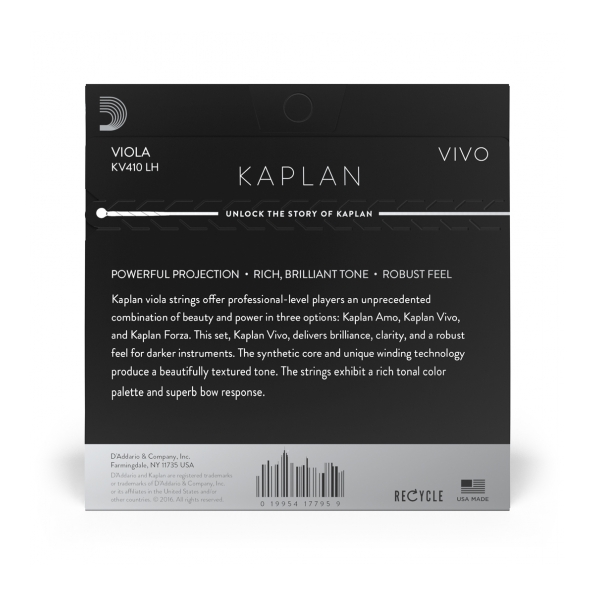 Las cuerdas para viola Kaplan ofrecen a los violistas profesionales toda una gama de opciones diseñadas para cubrir sus necesidades exactas: dos juegos de núcleo sintético, Kaplan Amo y Kaplan Vivo, y nuestro juego de núcleo de acero trenzado ya disponible, rebautizado como Kaplan Forza. Kaplan Amo ofrece calidez, riqueza y flexibilidad para instrumentos más brillantes, mientras que Kaplan Vivo aporta brillo, claridad y un tacto robusto para instrumentos más oscuros. Ambos juegos se asientan rápidamente, mostrando una paleta tonal rica y una excepcional respuesta al arco. Kaplan Forza, el juego con núcleo de acero trenzado, ofrece un nivel mucho más alto de claridad y enfoque tonal, y una respuesta al arco y tiempo de asentamiento más rápidos.