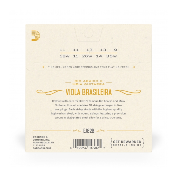 Las cuerdas para viola brasileira D’Addario EJ82B están fabricadas con cuerdas entorchadas de acero niquelado y cuerdas de acero estañado, optimizadas para rio abaixo y meia guitarra.