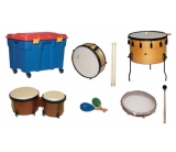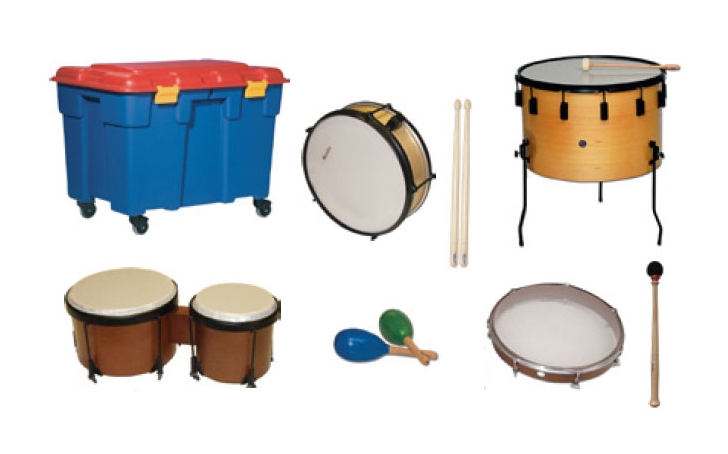 Lote instrumentos de membrana (baúl 56x81x61 cm con 4 ruedas incluido). Contenido: 1 Timbal escuela 25x22 cm; 1 timbal escuela 40x25 cm; 2 pares de mazas para los timbales; 1 pandero poliéster de 25 cm; 1 pandero poliéster 30 cm; 2 mazas para pandero; 1 caja escuela 12"; 1 par de baquetas para caja escuela; Bongo escolar Swing 6" y 8,5"; 1 par de maracas escolares. Medidas aproximadas: 56 x 81 x 61 cm. Fabricado en España.