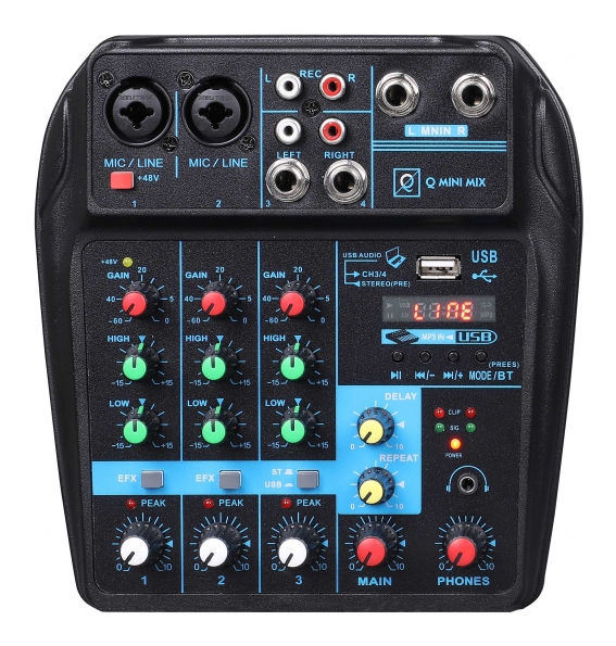 Mesa de mezclas de 4 canales. Reproductor MP3 mediante USB/Bluetooth. 4 canales ( 2 mono+ 1 estereo). 2 entradas XLR para micrófono. 2 entradas de línea. Previos de micro de alta calidad. Alimentación Phantom +48V. Control de ganancia por canal. Ecualización de 2 bandas por canal. Salida de auriculares con volumen independiente. Efectos de delay disponibles en canales 1 y 2. Salida principal 2 jack ¼. Entrada y salida auxiliar con RCA. Adaptador de corriente incluido.