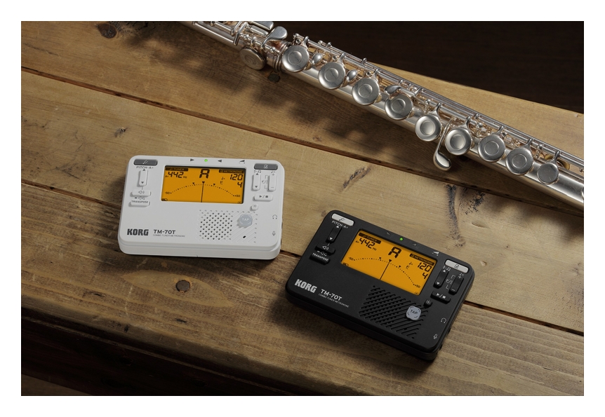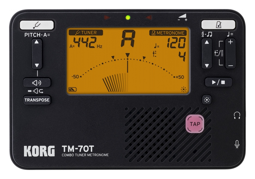 'La serie TM, un concepto innovador de afinador y metrónomo combinados, cuenta con una gran variedad de funciones y una visibilidad excepcional, y es lo último en afinación y entrenamiento rítmico para instrumentos de viento y cuerda.El último modelo, el TM-70T, eleva aún más el concepto original haciéndolo más fácil de usar que nunca. No sólo es lo suficientemente pequeño como para caber en un bolsillo, sino que incorpora una nueva pantalla con visibilidad mejorada y una nueva función de transposición (Fa, Sib, Mib), lo que lo convierte en el compañero ideal para cualquier músico. La calidad del sonido del metrónomo y de la salida de sonido también se ha mejorado para que sea fácil de oír incluso en entornos ruidosos.También se ha mejorado la calidad, la velocidad y la precisión de la afinación, que es esencial para cualquier interpretación.El TM-70T es completamente ''Made in Japan'', lo que es un testimonio del orgullo y compromiso de Korg con la calidad como líder en el mundo de los afinadores/metrónomos durante muchos años.EspecificacionesSección del afinadorEscala Temperamento igual de 12 notasRango de detección: C1 (32,70 Hz)-C8 (4186,01 Hz) con entrada de onda sinusoidalGeneración de tono de referencia: C3 (130,81 Hz)-C6 (1046,50 Hz) rango de tres octavasModos de sintonización: modo de medidor, modo de salida de sonido, modo de retorno de sonidoRango de calibración: A4=410-480 Hz (unidades de 1 Hz)Precisión de detección: mejor que +/-1 centésimaPrecisión del sonido: mejor que +/-1 centésimaSección MetrónomoRango de tempo: negra=30-252 veces/minutoMétodo de ajuste del tempo: paso de péndulo, paso completo, tap tempoRango de compás: 15 tipos (0-9 tiempos, dupletas, tresillos, tresillos con nota central omitida, cuatrillos, cuatrillos con notas centrales omitidas)Precisión del tempo: +/-0.3%Especificaciones principalesConectores: Jack de ENTRADA (minijack monoaural de 3,5 mm), Jack de auriculares (minijack de auriculares estéreo de 3,5 mm)Altavoz: Altavoz dinámico (?23 mm)Fuente de alimentación: Dos pilas AAA (3 V)Duración de las pilasAfinador: Aproximadamente 250/150/85 horas (retroiluminación: apagada/suave/automática, entrada A4 continua, utilizando pilas de zinc-carbono)Metrónomo: Aproximadamente 200/130/75 horas (retroiluminación: apagado/suave/automático, tempo 120, 4 tiempos, volumen máximo, con pilas de zinc-carbono)Dimensiones (An x Pr x Al): 107 mm x 72 mm x 18 mmPeso: 79 g (pilas incluidas)Variaciones de color: Negro, BlancoArtículos incluidos:Accesorios (se venden por separado): Micrófono de contacto CM-400'