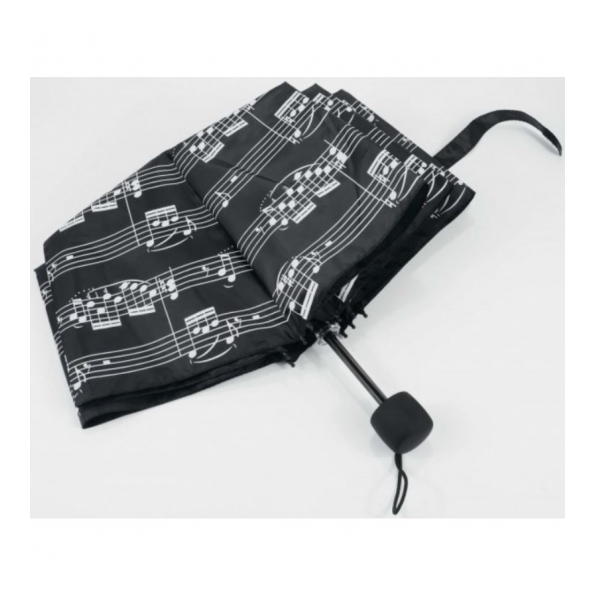 Mini paraguas negro, decorado con notas musicales en color blanco.
