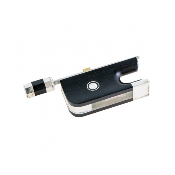 Nuez de ébano revestida para arco de contrabajo en sistema francés montada en plata. Tiene el ojo parisino y el Botón de tres piezas. CARACTERÍSTICAS