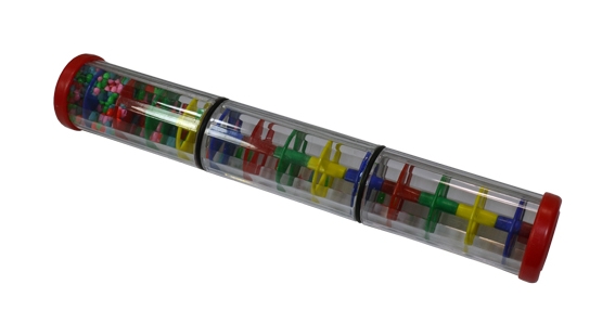 Palo de lluvia. Tamaño mediano, con tres secciones. Fabricado en plástico transparente con diferentes niveles en su interior por los que van descendiendo lentamente pequeñas bolitas de colores imitando el sonido de la lluvia. Peso aproximado 208g. Medidas aproximadas: Ø 4,5 x 30 cm.