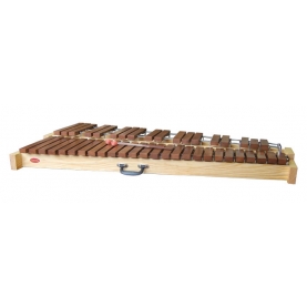 Xilófono bajo, parte cromática. 9 láminas de madera de Ipe afinadas a 440 Hz, Do#-Sol1#. Caja de resonancia de madera maciza. Un par de macitas incluidas. Soporte no incluido. Peso aproximado 16Kg. Fabricado en España.