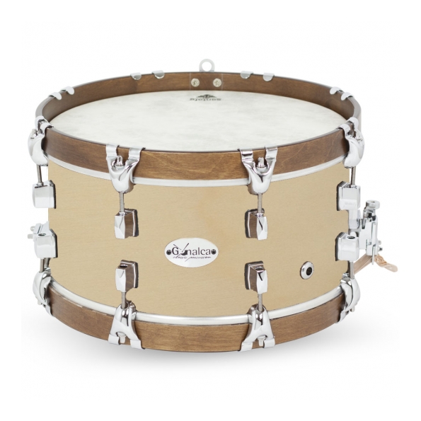 Casco abedul y aros de haya 8mm. Parches Remo Fiberskin III y Ambassador Snare. Mufle incluido. Arillo opcional. Sirven las fundas cód. 314 y 420. Tambor Gonalca.