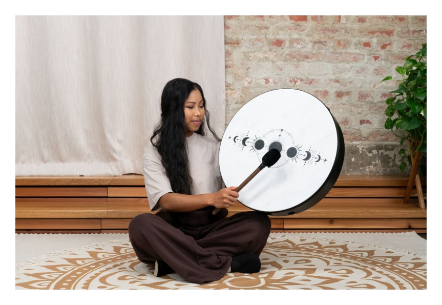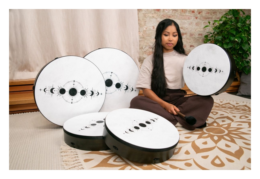 'Los tambores Meinl Sonic Energy Ritual Drums garantizan una resonancia notable que atrae sus sentidos durante baños de sonido, toma de tierra o sesiones musicales. La calidez innata y la profunda riqueza tonal transforman cada golpe en un encuentro fascinante, que abarca surcos rítmicos hasta latidos similares a los de un corazón. Da rienda suelta a tu creatividad y forja tus ritmos únicos usando el mazo provisto, mientras exploras el cautivador potencial de estos tambores. Cordón cruzado para un perfecto agarre,,Tonos profundos y cálidos,,Perfecto para sesiones de conexión a tierra y baños sonoros,,Símbolo de las fases de la luna,,Vegano. Tamaños20'' x 3,5'', 50,8 cm x 8,9 cm'