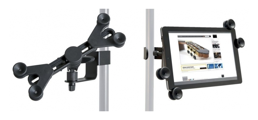 Apto para la mayoría de tabletas (Apple, Android, Windows)Para montar en el soporte de micro con rosca de 5/8“ o en un trípodecon la pinza suministrada (1025mm). Se puede rotar e inclinarTodas las conexiones permanecen completamente accesiblesDos tamaños disponibles