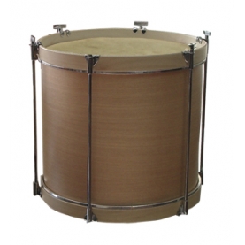 Timbal tradicional de madera, Ø 30.5 cm/12" x 50 cm altura, tensado con cuerda. Cuerpo y aros de madera. Acabado natural. Parches de piel. Fabricado en España.