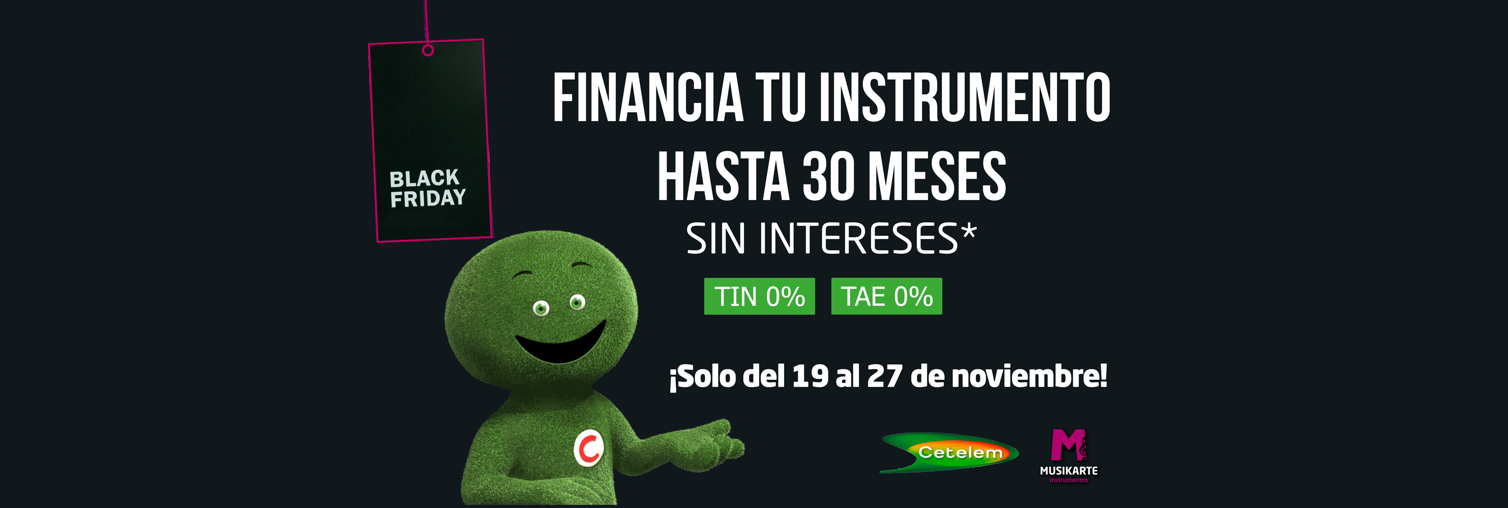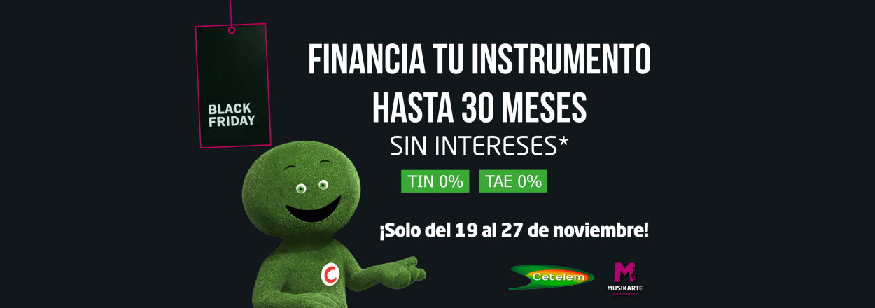 Las ofertas y descuentos del Black Friday no solo llega solo para instrumentos, libros o accesorios. En esta ocasión, contamos con una promoción única, válida desde el 19 al 27 de noviembre de 2018, para importes comprendidos entre 120 euros y 1.400 euros, con una Financiación de hasta en 30 meses sin intereses. TIN 0% TAE 0%.