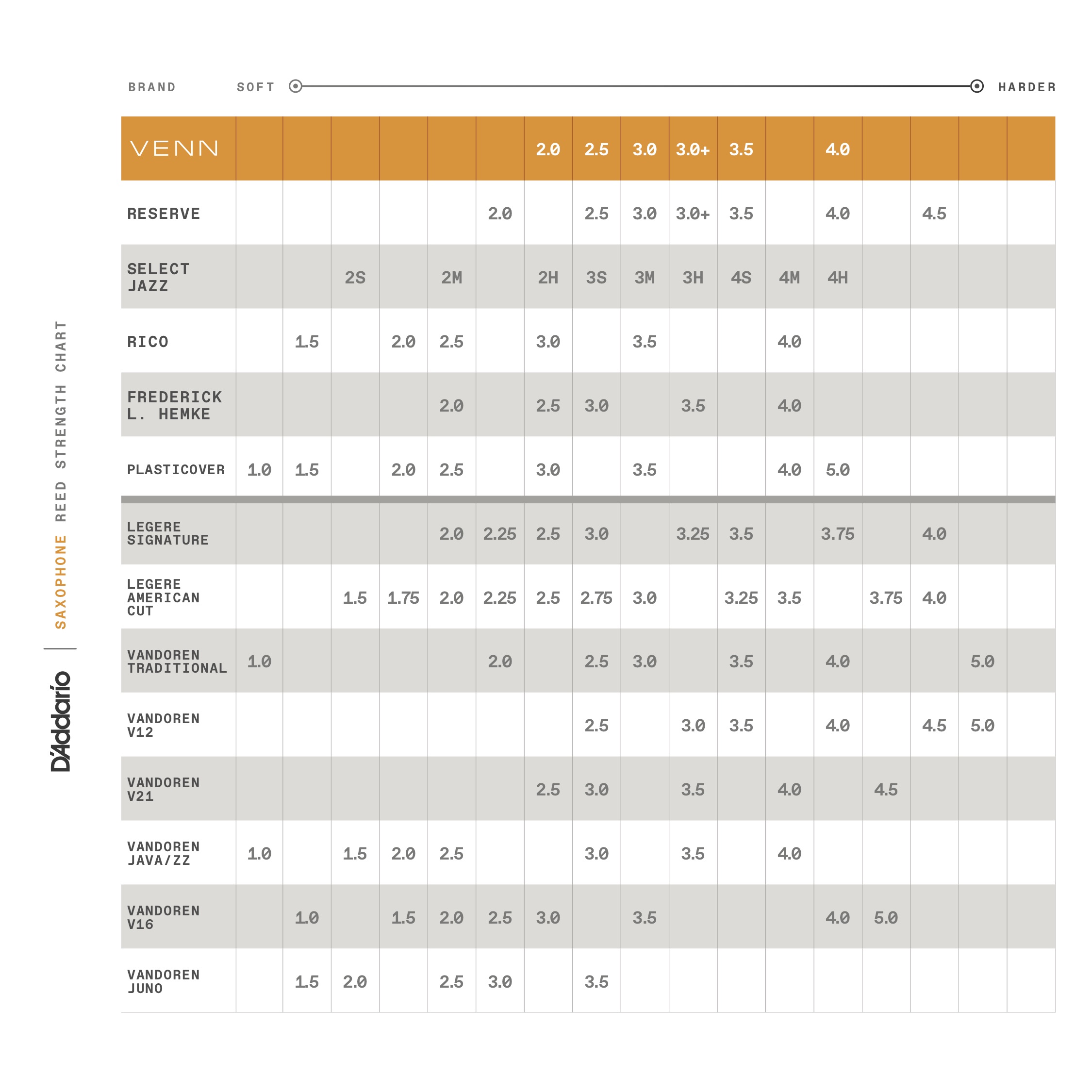 Los ingenieros más venerados de la industria han creado para D´ Addarío lo último en cañas sintéticas, las cañas VENN. Han conseguido combinar la estabilidad y longevidad de una caña sintética con el sonido y el tacto de una caña natural.