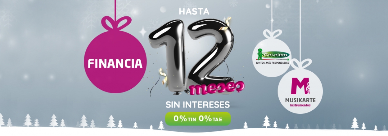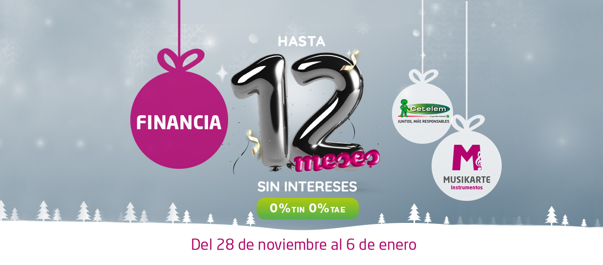 Las ofertas y promociones de Navidad no solo llega solo para instrumentos, libros o accesorios. En esta ocasión, contamos con una promoción única, válida desde el del 28 de noviembre al 6 de enero, para importes comprendidos entre 120 euros y 1.400 euros, con una Financiación de hasta 12 meses sin intereses. TIN 0% TAE 0%.
